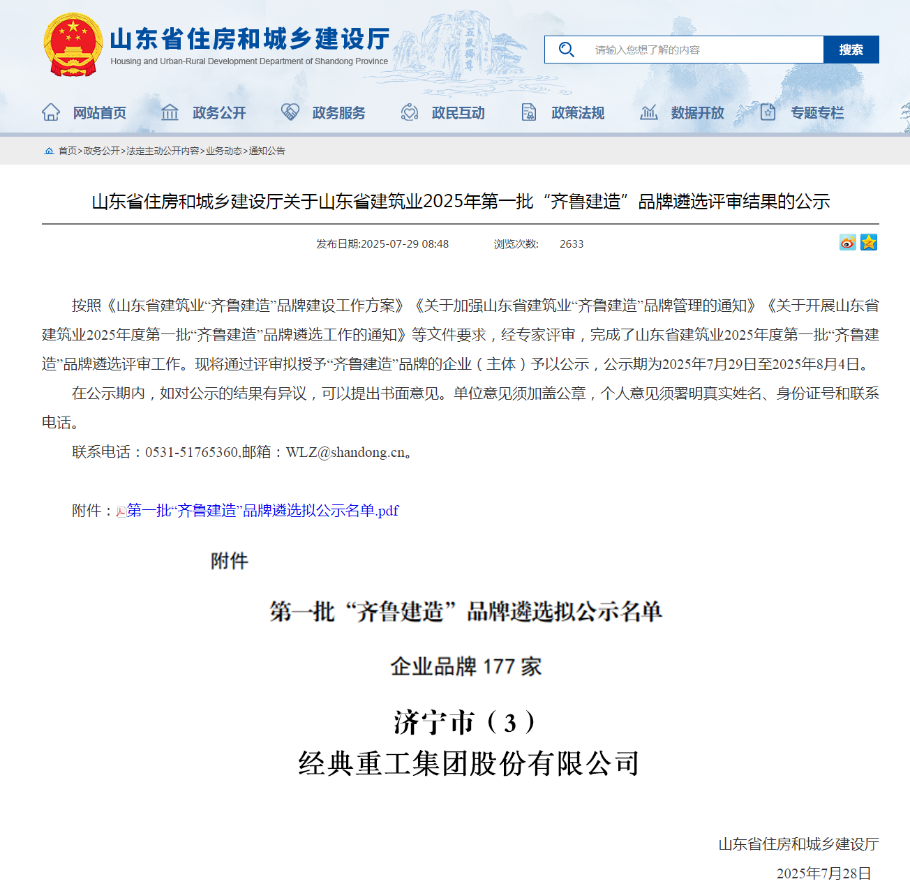 近日,山東省住房和城鄉(xiāng)建設(shè)廳正式公布2025年第一批“齊魯建造”品牌遴選名單,經(jīng)典重工集團股份有限公司憑借在鋼結(jié)構(gòu)建筑部品建材領(lǐng)域的技術(shù)實力與品牌影響力,成功入選部品建材品牌名錄,這標(biāo)志著公司在推動建筑產(chǎn)業(yè)現(xiàn)代化、智能化、綠色化發(fā)展方面的綜合實力又獲省級權(quán)威認(rèn)可。2025-08-06 -
